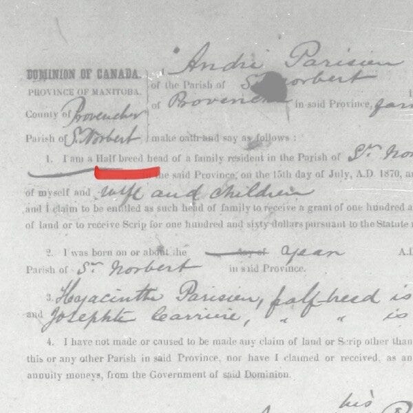 After Manitoba's confederation on July 15, 1870, my grandfather signed a Métis scrip (or "half-breed" scrip) issued by the Dominion of Canada which was redeemable for $160 or 160 acres of land in exchange for their Métis land rights.